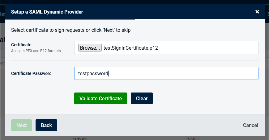 Here we can setup an optional certificate that can be used by your Service Provider to sign requests. This helps to ensure that requests are coming from a legitimate source.